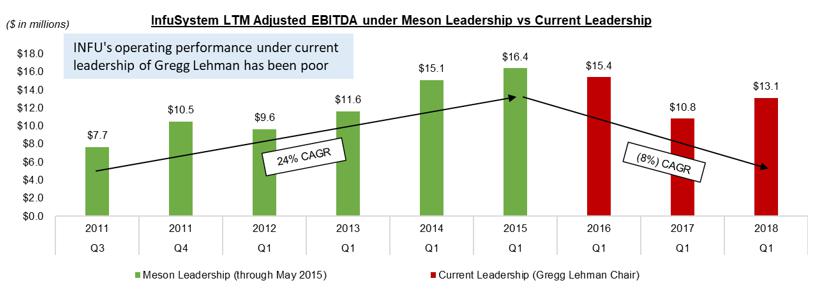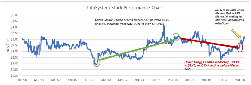 We are seeking to reconstitute the Board because we believe stockholders can no longer stand idly by as InfuSystem’s operating and financial performance continue to fall well below both the expectations set by the Board and the Company’s true potential. Under Chairman Gregg Lehman since May 15, 2015, InfuSystem’s stock has declined from $3.20 to $2.40 on March 20, 2018 prior to Meson filing its 13D indicating interest in strategic alternatives for the Company. Adjusted EBITDA has also declined from $16.4m to $13.1m during the three years of Mr. Lehman’s tenure as Chairman. This contrasts sharply to the steady increase in EBITDA in the four years prior despite Medicare reimbursement cuts of 20% during that period as well.