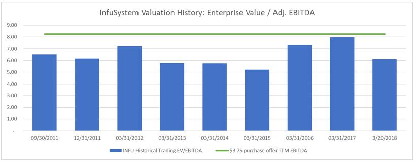 The valuation offered with the $3.75 bid represents a significant premium to the historical trading range on an Enterprise Value/EBITDA basis at 11x EBITDA and 8.3x Adjusted EBIDTA as reported by InfuSystem. Even under optimistic assumptions of Adjusted EBITDA growth from the Trailing Twelve Month [$13.1m], $3.75 represents a significantly higher multiple than the Company’s stock has traded at any point in the past (see “Reasons for the Solicitation” in the attached Proxy Statement for a chart which shows the Company’s historical Adjusted EBIDTA multiple versus its Enterprise Value to reflect the $3.75 per share bid price).