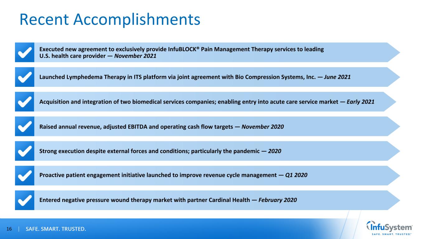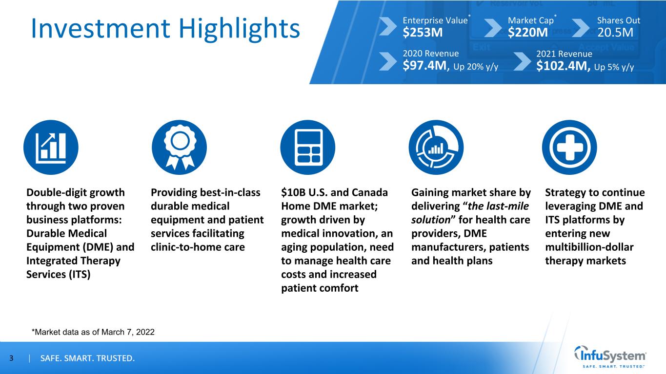 Forward-Looking Statements / Non-GAAP Measures Forward-Looking Statements Certain statements contained in this presentation are forward-looking statements within the meaning of Section 27A of the Securities Act of 1933, as amended, and Section 21E of the Securities Exchange Act of 1934, as amended, such as statements relating to future actions, business plans, objectives and prospects, our share repurchase program and capital allocation strategy, future operating or financial performance and guidance. The words “believe,” “may,” “will,” “estimate,” “continue,” “anticipate,” “intend,” “should,” “plan,” “expect,” “strategy,” “future,” “likely,” variations of such words, and other similar expressions, as they relate to the Company, are intended to identify forward-looking statements. Forward-looking statements are subject to factors, risks and uncertainties that could cause actual results to differ materially, including, but not limited to, the uncertain impact of the COVID-19 pandemic, our dependence on estimates of collectible revenue, potential litigation, changes in third-party reimbursement processes, changes in law, contributions from acquired businesses or new business lines, products or services and other risk factors disclosed in the Company’s most recent annual report on Form 10-K and, to the extent applicable, quarterly reports on Form 10-Q. All forward-looking statements made in this presentation speak only as of the date hereof. InfuSystem does not undertake any obligation to update any forward-looking statements to reflect future events or circumstances, except as required by law. Non-GAAP Measures This presentation contains information prepared in conformity with GAAP as well as non-GAAP financial information. The Company believes that the non-GAAP financial measures presented in this presentation provide useful information to the Company’s management, investors and other interested parties about the Company’s operating performance because they allow them to understand and compare the Company’s operating results during the current periods to the prior year periods in a more consistent manner. This non-GAAP information should be considered by the reader in addition to, but not instead of, the financial statements prepared in accordance with GAAP, and similarly titled non-GAAP measures may be calculated differently by other companies. The Company calculates those non-GAAP measures by adjusting for nonrecurring or non-core items that are not part of the normal course of business and that the Company’s management does not believe will have similar comparable year-over-year items. A reconciliation of those measures to the most directly comparable GAAP measures is provided in Appendix A of this presentation. 2