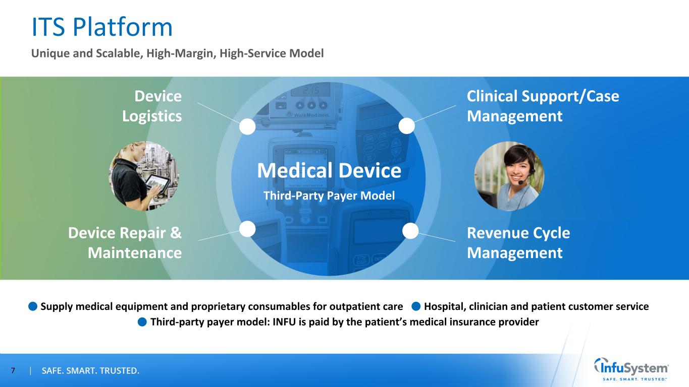 Medical Device Sale/Lease to Hospitals & Clinics Source Devices Supply Consumables to Hospitals & Clinics Device Repair & Maintenance DME Platform Traditional Medical Distribution, Lower-Margin, High-Turn Model • Pump rentals and VAR sales (new devices) Broker/trader sales (used devices) • Biomedical service and repair Direct payer model: INFU is paid directly by the hospital/clinic/home care provider Direct Payer Model 6