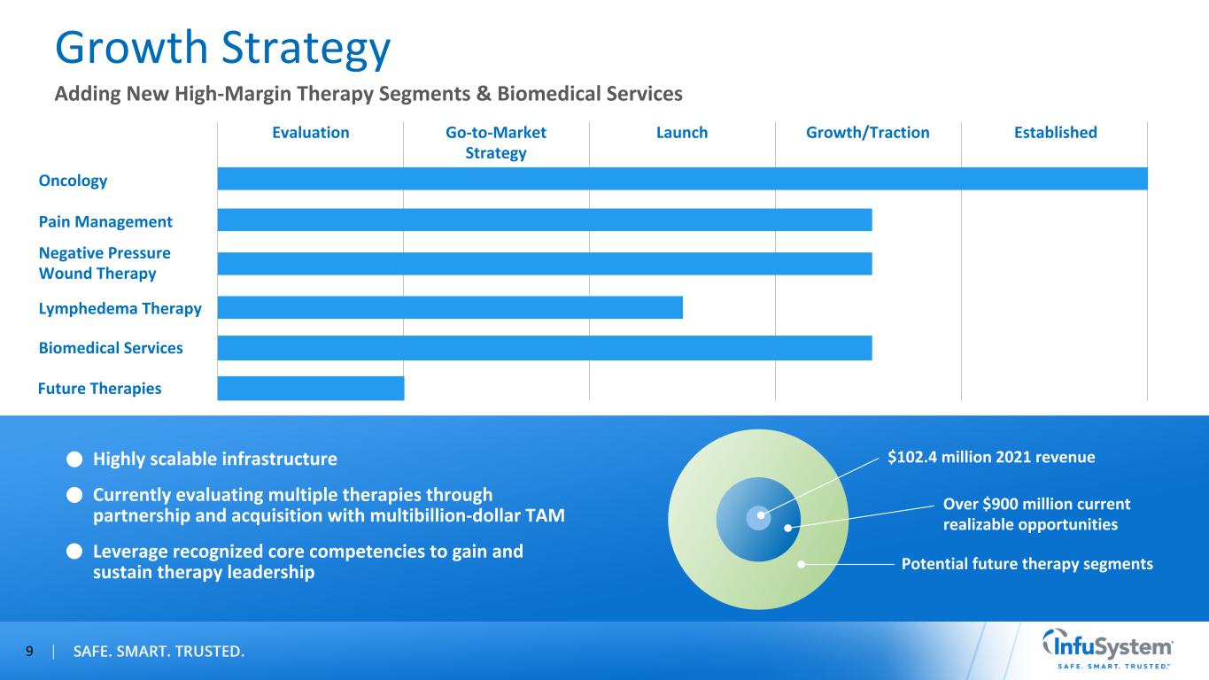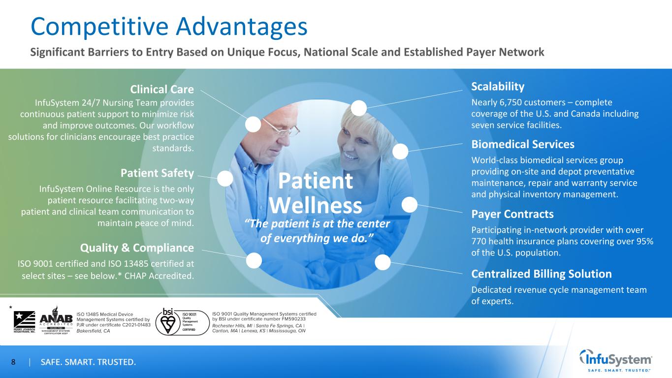 Competitive Advantages Significant Barriers to Entry Based on Unique Focus, National Scale and Established Payer Network Patient Wellness Patient Safety InfuSystem Online Resource is the only patient resource facilitating two-way patient and clinical team communication to maintain peace of mind. Scalability Nearly 6,750 customers – complete coverage of the U.S. and Canada including seven service facilities. Clinical Care InfuSystem 24/7 Nursing Team provides continuous patient support to minimize risk and improve outcomes. Our workflow solutions for clinicians encourage best practice standards. Payer Contracts Participating in-network provider with over 770 health insurance plans covering over 95% of the U.S. population.Quality & Compliance ISO 9001 certified and ISO 13485 certified at select sites – see below.* CHAP Accredited. Biomedical Services World-class biomedical services group providing on-site and depot preventative maintenance, repair and warranty service and physical inventory management. Centralized Billing Solution Dedicated revenue cycle management team of experts. “The patient is at the center of everything we do.” * 8