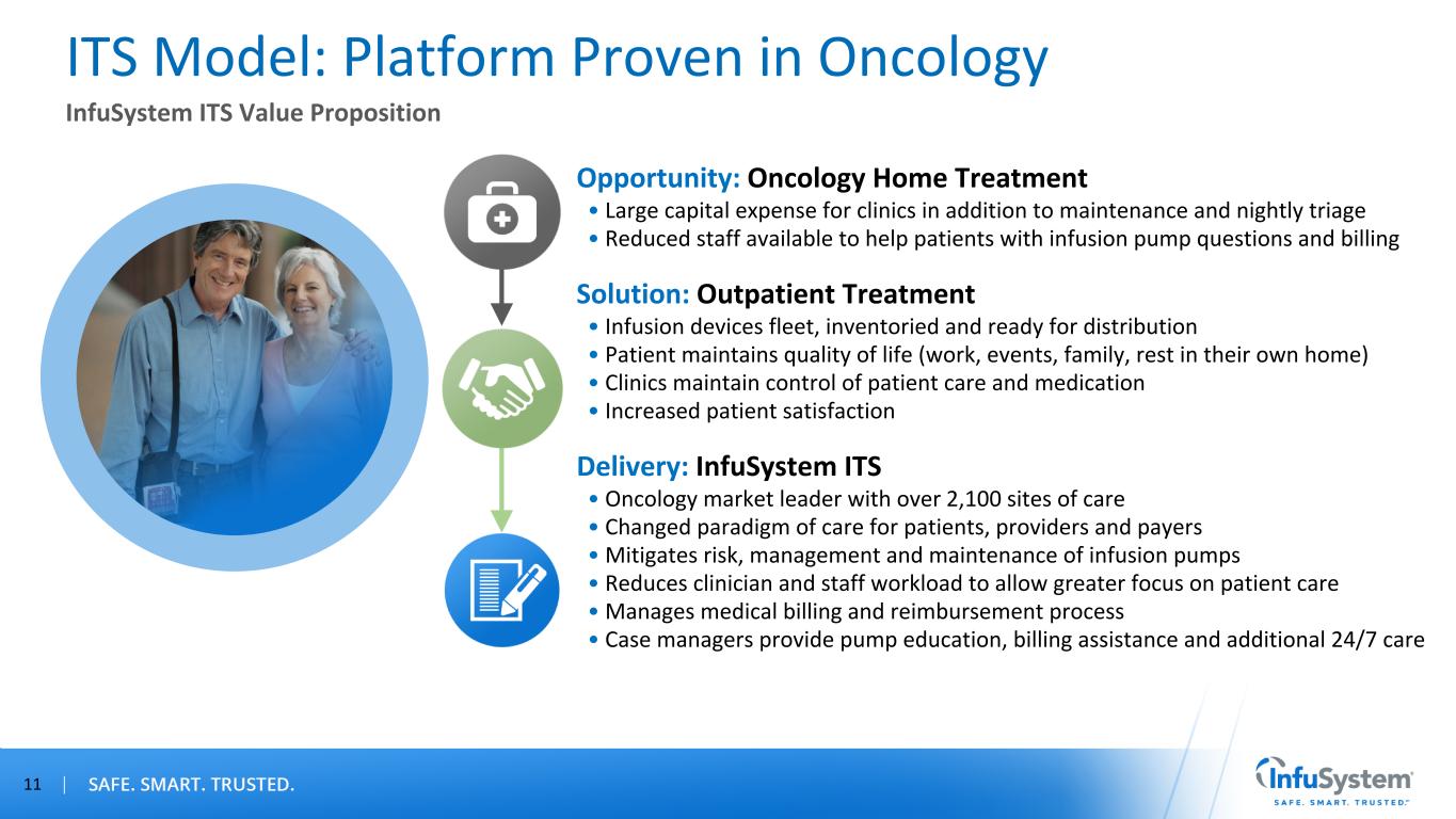 Highly Scalable Existing Infrastructure Offices and Logistics • Full Coverage of the U.S. and Canada (MI, KS, CA, MA, TX, Ontario) Sales and Marketing • Territories with overlapping coverage and incentive for new therapies • Staffing efficiencies to service multiple therapies Revenue Cycle Team/ Case Management • Automated systems and greatly improved productivity • Existing payer relationships are a key competitive advantage 35 Years of Experience, Know-How and Reputation for Excellence • Critical mass with focus on best-in-class services • Device- and therapy-agnostic logistics, service, billing model • Device manufacturer relationships offer future opportunities Oncology Pain Management NPWT Lymphedema Future Therapies Foundation Built In Oncology: Leveraged It Multiple Times (Pain, NPWT, Lymphedema) 10