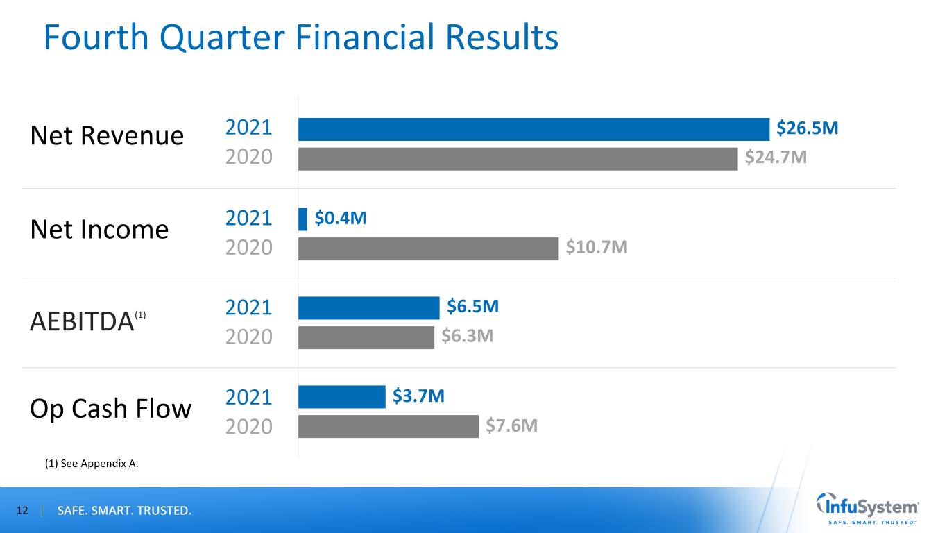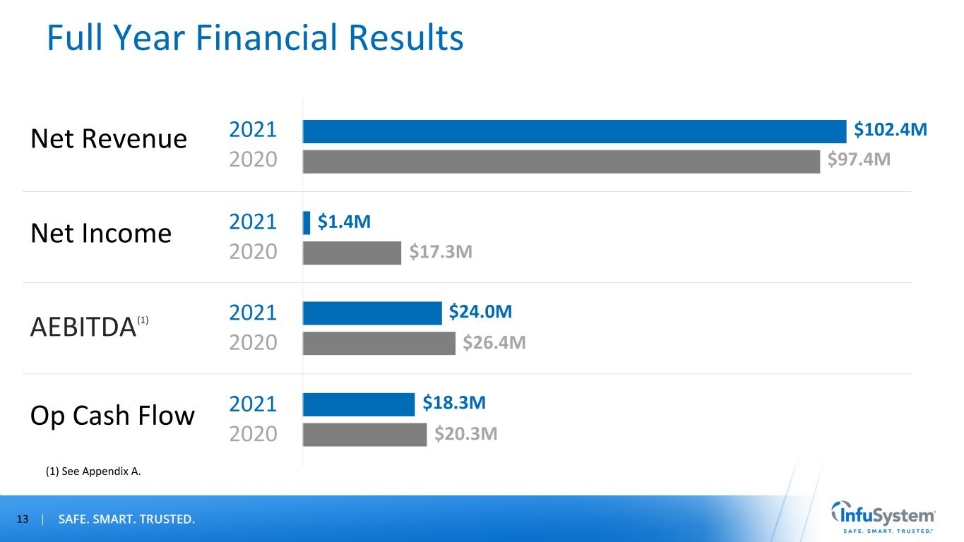 Fourth Quarter Financial Results Net Revenue Net Income AEBITDA Op Cash Flow 2021 2020 2021 2020 2021 2020 2021 2020 $26.5M $24.7M $6.5M $6.3M $3.7M $7.6M (1) See Appendix A. $0.4M $10.7M 12 (1)