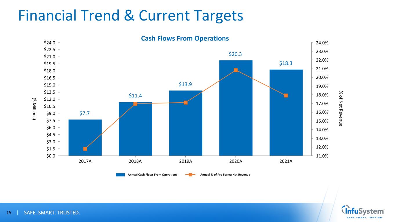 2017A 2018A 2019A 2020A 2021A $0 $20 $40 $60 $80 $100 $120 $ $5 $10 $15 $20 $25 $30 Notes: 1. 2017 consolidated revenues have been adjusted to reflect the effect of the adoption of ASC 606 in 2018. 2. See Appendix A. Revenue ($ M illions) Financial Trend Annual Net Revenue Annual AEBITDA A EBITD A ($ M illions) 14 Net Revenues(1) & AEBITDA(2) $65.5 $67.1 $81.1 $97.4 $102.4 $26.4 $24.0 $18.4 $13.8 $11.6