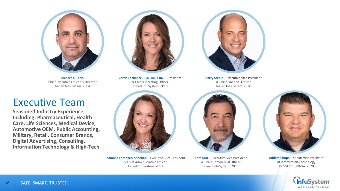 Executive Team Seasoned Industry Experience, Including: Pharmaceutical, Health Care, Life Sciences, Medical Device, Automotive OEM, Public Accounting, Military, Retail, Consumer Brands, Digital Advertising, Consulting, Information Technology & High-Tech Jeannine Lombardi Sheehan – Executive Vice President & Chief Administrative Officer Joined InfuSystem: 2019 Tom Ruiz – Executive Vice President & Chief Commercial Officer Joined InfuSystem: 2010 Barry Steele – Executive Vice President & Chief Financial Officer Joined InfuSystem: 2020 Richard DiIorio Chief Executive Officer & Director Joined InfuSystem: 2004 18 Carrie Lachance, BSN, RN, CRNI – President & Chief Operating Officer Joined InfuSystem: 2010 Addam Chupa – Senior Vice President of Information Technology Joined InfuSystem: 2020