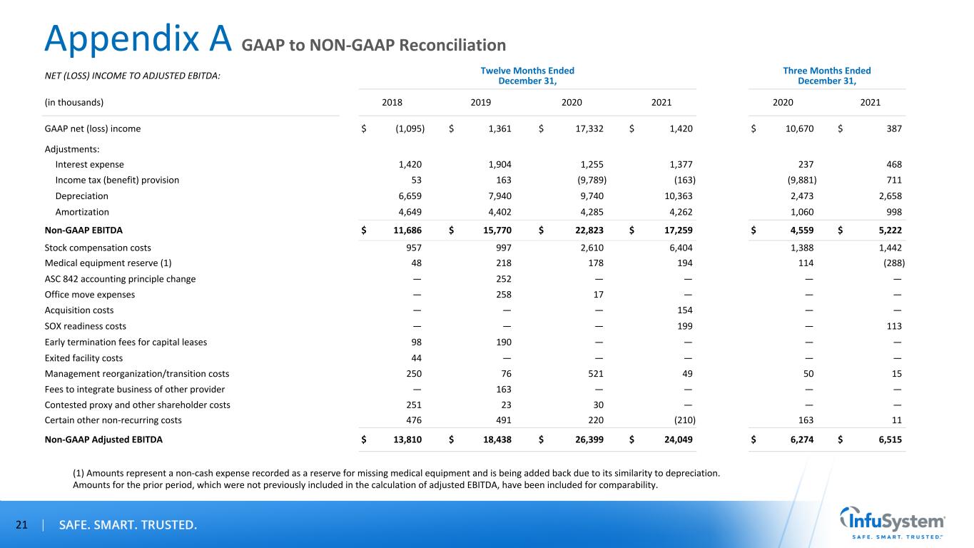 Appendix A GAAP to NON-GAAP Reconciliation (1) Amounts represent a non-cash expense recorded as a reserve for missing medical equipment and is being added back due to its similarity to depreciation. Amounts for the prior period, which were not previously included in the calculation of adjusted EBITDA, have been included for comparability. NET (LOSS) INCOME TO ADJUSTED EBITDA: Twelve Months Ended December 31, Three Months Ended December 31, (in thousands) 2018 2019 2020 2021 2020 2021 GAAP net (loss) income $ (1,095) $ 1,361 $ 17,332 $ 1,420 $ 10,670 $ 387 Adjustments: Interest expense 1,420 1,904 1,255 1,377 237 468 Income tax (benefit) provision 53 163 (9,789) (163) (9,881) 711 Depreciation 6,659 7,940 9,740 10,363 2,473 2,658 Amortization 4,649 4,402 4,285 4,262 1,060 998 Non-GAAP EBITDA $ 11,686 $ 15,770 $ 22,823 $ 17,259 $ 4,559 $ 5,222 Stock compensation costs 957 997 2,610 6,404 1,388 1,442 Medical equipment reserve (1) 48 218 178 194 114 (288) ASC 842 accounting principle change — 252 — — — — Office move expenses — 258 17 — — — Acquisition costs — — — 154 — — SOX readiness costs — — — 199 — 113 Early termination fees for capital leases 98 190 — — — — Exited facility costs 44 — — — — — Management reorganization/transition costs 250 76 521 49 50 15 Fees to integrate business of other provider — 163 — — — — Contested proxy and other shareholder costs 251 23 30 — — — Certain other non-recurring costs 476 491 220 (210) 163 11 Non-GAAP Adjusted EBITDA $ 13,810 $ 18,438 $ 26,399 $ 24,049 $ 6,274 $ 6,515 21