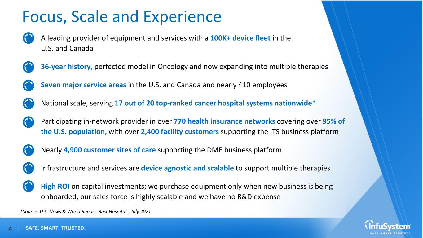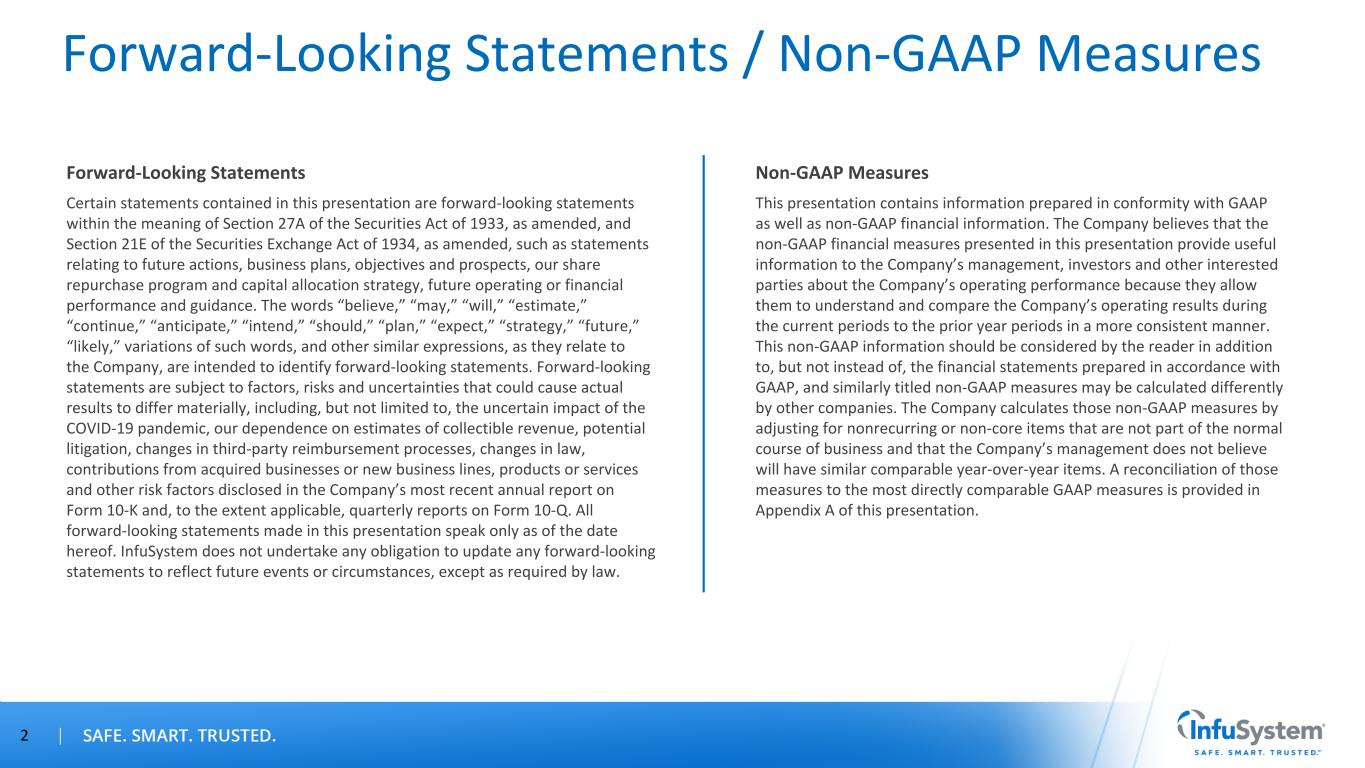 Forward-Looking Statements / Non-GAAP Measures Forward-Looking Statements Certain statements contained in this presentation are forward-looking statements within the meaning of Section 27A of the Securities Act of 1933, as amended, and Section 21E of the Securities Exchange Act of 1934, as amended, such as statements relating to future actions, business plans, objectives and prospects, our share repurchase program and capital allocation strategy, future operating or financial performance and guidance. The words “believe,” “may,” “will,” “estimate,” “continue,” “anticipate,” “intend,” “should,” “plan,” “expect,” “strategy,” “future,” “likely,” variations of such words, and other similar expressions, as they relate to the Company, are intended to identify forward-looking statements. Forward-looking statements are subject to factors, risks and uncertainties that could cause actual results to differ materially, including, but not limited to, the uncertain impact of the COVID-19 pandemic, our dependence on estimates of collectible revenue, potential litigation, changes in third-party reimbursement processes, changes in law, contributions from acquired businesses or new business lines, products or services and other risk factors disclosed in the Company’s most recent annual report on Form 10-K and, to the extent applicable, quarterly reports on Form 10-Q. All forward-looking statements made in this presentation speak only as of the date hereof. InfuSystem does not undertake any obligation to update any forward-looking statements to reflect future events or circumstances, except as required by law. Non-GAAP Measures This presentation contains information prepared in conformity with GAAP as well as non-GAAP financial information. The Company believes that the non-GAAP financial measures presented in this presentation provide useful information to the Company’s management, investors and other interested parties about the Company’s operating performance because they allow them to understand and compare the Company’s operating results during the current periods to the prior year periods in a more consistent manner. This non-GAAP information should be considered by the reader in addition to, but not instead of, the financial statements prepared in accordance with GAAP, and similarly titled non-GAAP measures may be calculated differently by other companies. The Company calculates those non-GAAP measures by adjusting for nonrecurring or non-core items that are not part of the normal course of business and that the Company’s management does not believe will have similar comparable year-over-year items. A reconciliation of those measures to the most directly comparable GAAP measures is provided in Appendix A of this presentation. 2