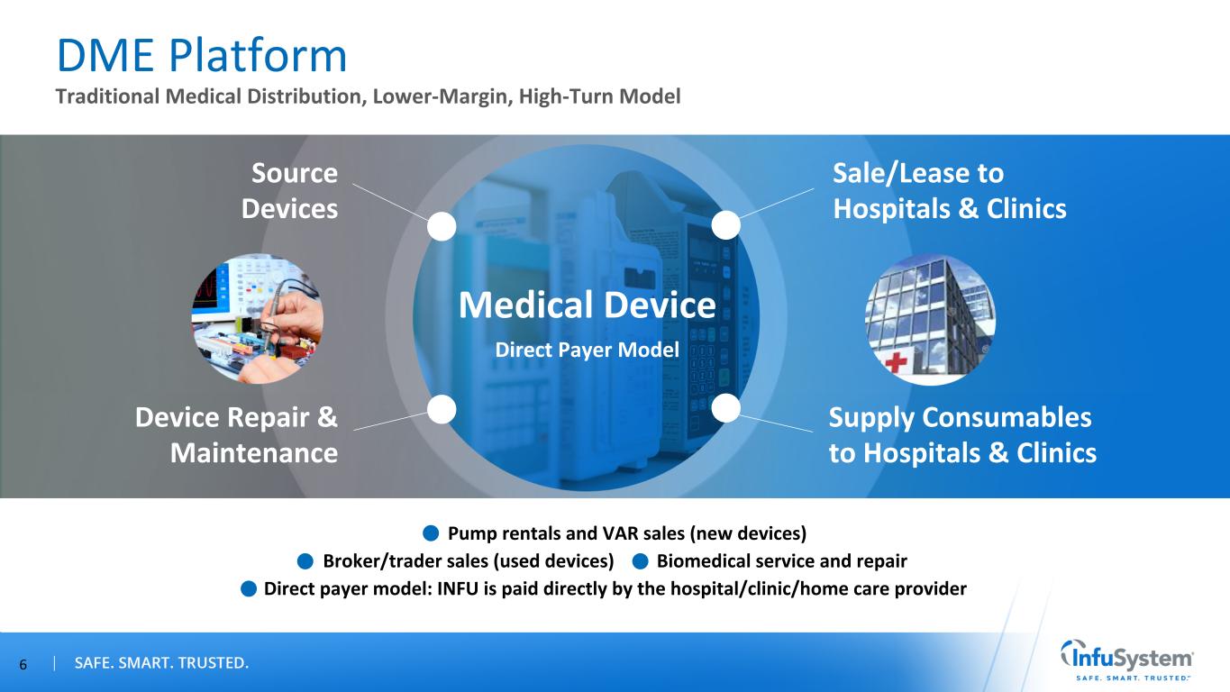 Medical Device Sale/Lease to Hospitals & Clinics Source Devices Supply Consumables to Hospitals & Clinics Device Repair & Maintenance DME Platform Traditional Medical Distribution, Lower-Margin, High-Turn Model • Pump rentals and VAR sales (new devices) Broker/trader sales (used devices) • Biomedical service and repair Direct payer model: INFU is paid directly by the hospital/clinic/home care provider Direct Payer Model 6