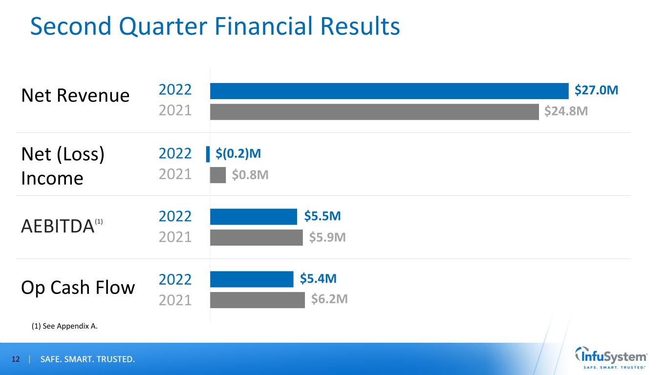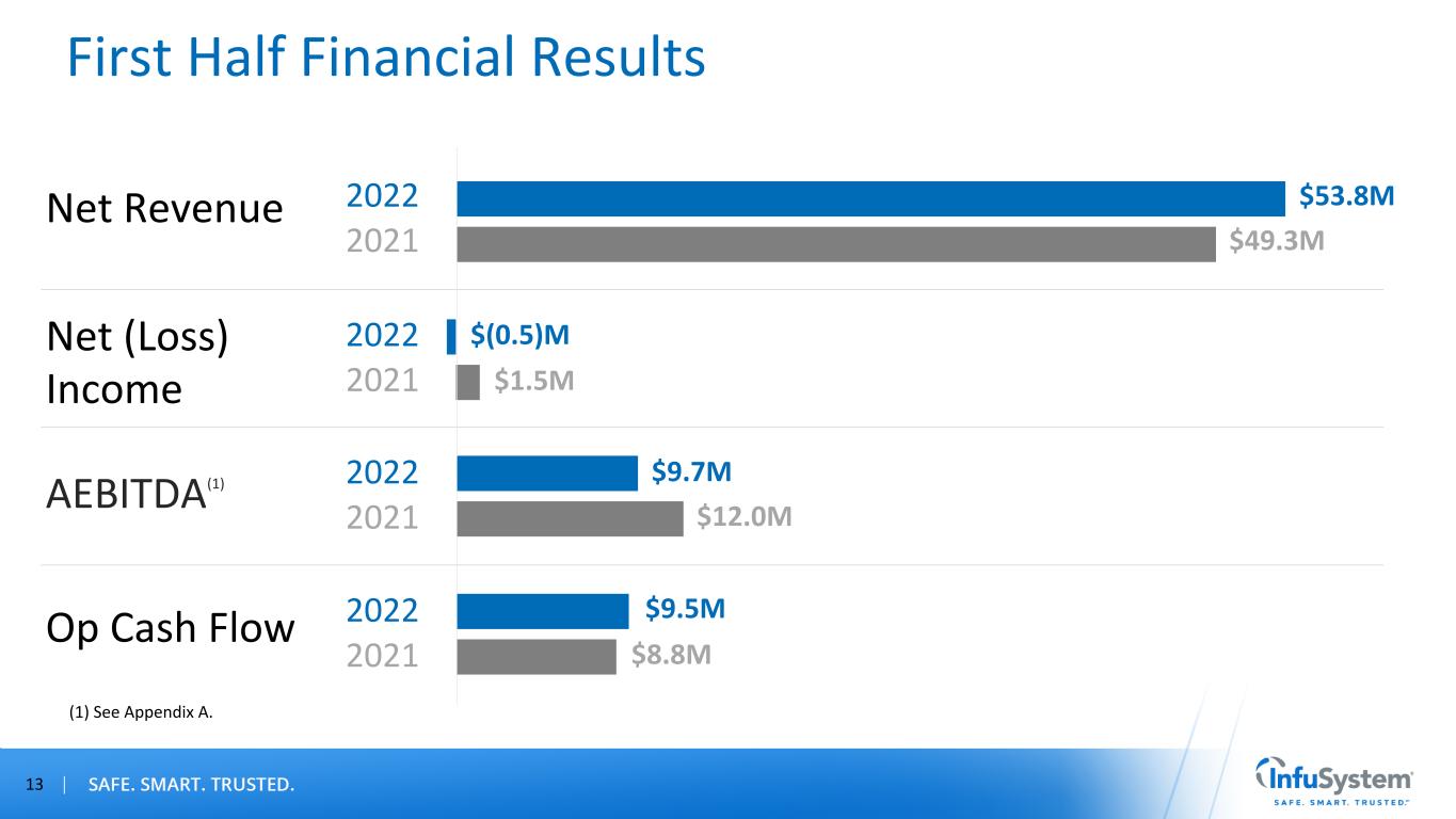 Second Quarter Financial Results Net Revenue Net (Loss) Income AEBITDA Op Cash Flow 2022 2021 2022 2021 2022 2021 2022 2021 $27.0M $24.8M $5.5M $5.9M $5.4M $6.2M (1) See Appendix A. $(0.2)M $0.8M 12 (1)