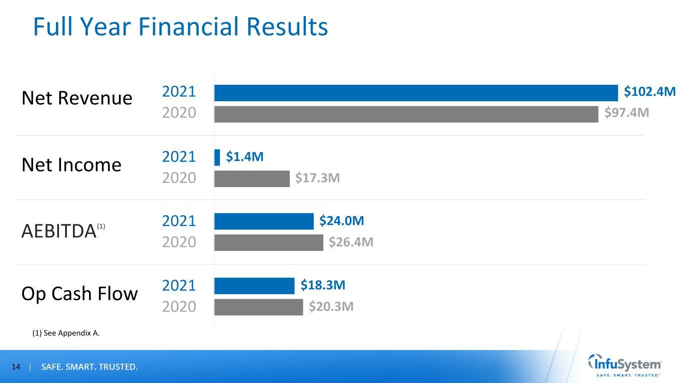 First Half Financial Results Net Revenue Net (Loss) Income AEBITDA Op Cash Flow 2022 2021 2022 2021 2022 2021 2022 2021 $53.8M $49.3M $9.7M $12.0M $9.5M $8.8M (1) See Appendix A. $(0.5)M $1.5M 13 (1)