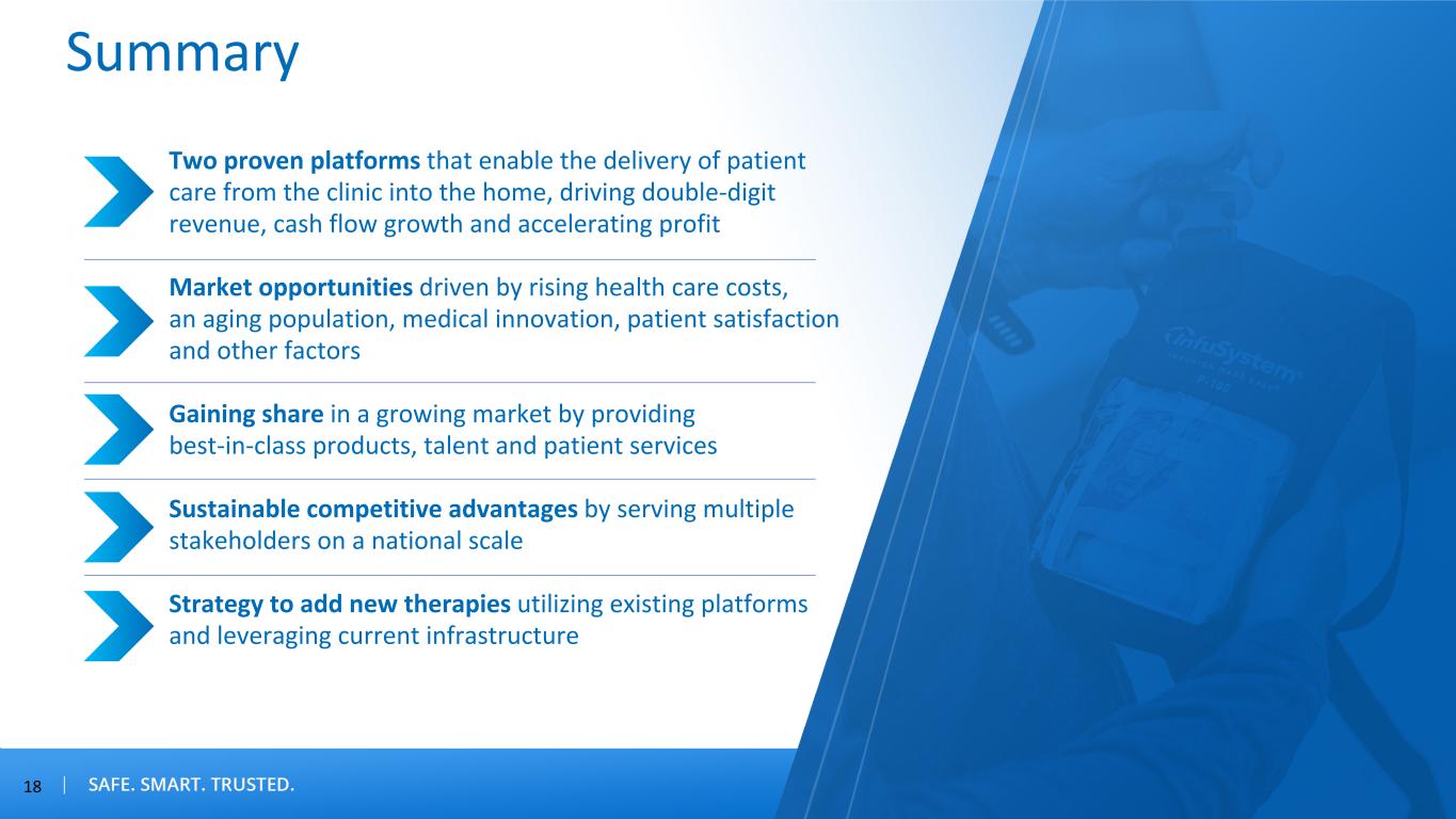 Competitive Advantages Significant Barriers to Entry Based on Unique Focus, National Scale and Established Payer Network Patient Wellness Patient Safety InfuSystem Online Resource is the only patient resource facilitating two-way patient and clinical team communication to maintain peace of mind. Scalability Over 6,750 customers – complete coverage of the U.S. and Canada including seven service facilities. Clinical Care InfuSystem 24/7 Nursing Team provides continuous patient support to minimize risk and improve outcomes. Our workflow solutions for clinicians encourage best practice standards. Payer Contracts Participating in-network provider with over 770 health insurance plans covering 95% of the U.S. population.Quality & Compliance ISO 9001 certified and ISO 13485 certified at select sites – see below.* CHAP Accredited. Biomedical Services World-class biomedical services group providing on-site and depot preventative maintenance, repair and warranty service and physical inventory management. Centralized Billing Solution Dedicated revenue cycle management team of experts. “The patient is at the center of everything we do.” * 8