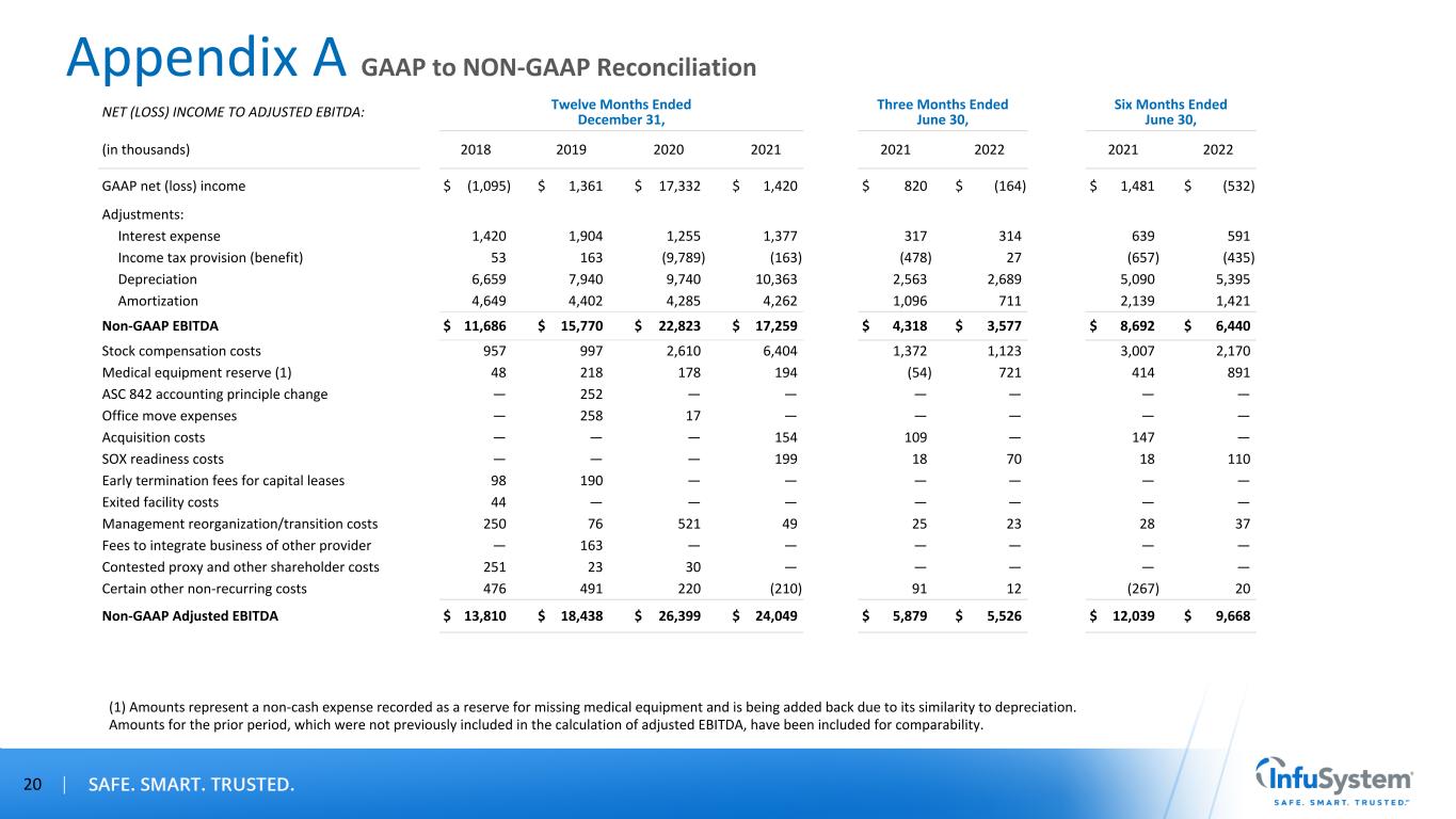 Appendix A GAAP to NON-GAAP Reconciliation (1) Amounts represent a non-cash expense recorded as a reserve for missing medical equipment and is being added back due to its similarity to depreciation. Amounts for the prior period, which were not previously included in the calculation of adjusted EBITDA, have been included for comparability. NET (LOSS) INCOME TO ADJUSTED EBITDA: Twelve Months Ended December 31, Three Months Ended June 30, Six Months Ended June 30, (in thousands) 2018 2019 2020 2021 2021 2022 2021 2022 GAAP net (loss) income $ (1,095) $ 1,361 $ 17,332 $ 1,420 $ 820 $ (164) $ 1,481 $ (532) Adjustments: Interest expense 1,420 1,904 1,255 1,377 317 314 639 591 Income tax provision (benefit) 53 163 (9,789) (163) (478) 27 (657) (435) Depreciation 6,659 7,940 9,740 10,363 2,563 2,689 5,090 5,395 Amortization 4,649 4,402 4,285 4,262 1,096 711 2,139 1,421 Non-GAAP EBITDA $ 11,686 $ 15,770 $ 22,823 $ 17,259 $ 4,318 $ 3,577 $ 8,692 $ 6,440 Stock compensation costs 957 997 2,610 6,404 1,372 1,123 3,007 2,170 Medical equipment reserve (1) 48 218 178 194 (54) 721 414 891 ASC 842 accounting principle change — 252 — — — — — — Office move expenses — 258 17 — — — — — Acquisition costs — — — 154 109 — 147 — SOX readiness costs — — — 199 18 70 18 110 Early termination fees for capital leases 98 190 — — — — — — Exited facility costs 44 — — — — — — — Management reorganization/transition costs 250 76 521 49 25 23 28 37 Fees to integrate business of other provider — 163 — — — — — — Contested proxy and other shareholder costs 251 23 30 — — — — — Certain other non-recurring costs 476 491 220 (210) 91 12 (267) 20 Non-GAAP Adjusted EBITDA $ 13,810 $ 18,438 $ 26,399 $ 24,049 $ 5,879 $ 5,526 $ 12,039 $ 9,668 20