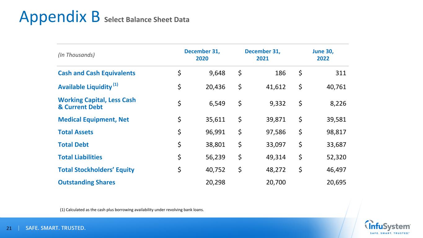 (1) Calculated as the cash plus borrowing availability under revolving bank loans. Appendix B Select Balance Sheet Data (In Thousands) December 31, 2020 December 31, 2021 June 30, 2022 Cash and Cash Equivalents $ 9,648 $ 186 $ 311 Available Liquidity (1) $ 20,436 $ 41,612 $ 40,761 Working Capital, Less Cash & Current Debt $ 6,549 $ 9,332 $ 8,226 Medical Equipment, Net $ 35,611 $ 39,871 $ 39,581 Total Assets $ 96,991 $ 97,586 $ 98,817 Total Debt $ 38,801 $ 33,097 $ 33,687 Total Liabilities $ 56,239 $ 49,314 $ 52,320 Total Stockholders’ Equity $ 40,752 $ 48,272 $ 46,497 Outstanding Shares 20,298 20,700 20,695 21