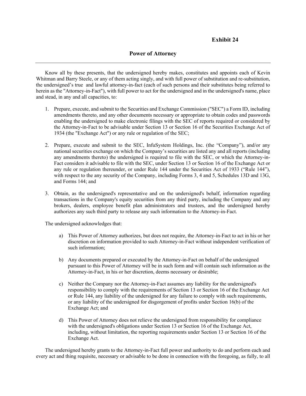 Exhibit 24 Power of Attorney Know all by these presents, that the undersigned hereby makes, constitutes and appoints each of Kevin Whitman and Barry Steele, or any of them acting singly, and with full power of substitution and re-substitution, the undersigned’s true and lawful attorney-in-fact (each of such persons and their substitutes being referred to herein as the "Attorney-in-Fact"), with full power to act for the undersigned and in the undersigned's name, place and stead, in any and all capacities, to: 1. Prepare, execute, and submit to the Securities and Exchange Commission ("SEC") a Form ID, including amendments thereto, and any other documents necessary or appropriate to obtain codes and passwords enabling the undersigned to make electronic filings with the SEC of reports required or considered by the Attorney-in-Fact to be advisable under Section 13 or Section 16 of the Securities Exchange Act of 1934 (the "Exchange Act") or any rule or regulation of the SEC; 2. Prepare, execute and submit to the SEC, InfuSystem Holdings, Inc. (the “Company”), and/or any national securities exchange on which the Company’s securities are listed any and all reports (including any amendments thereto) the undersigned is required to file with the SEC, or which the Attorney-in- Fact considers it advisable to file with the SEC, under Section 13 or Section 16 of the Exchange Act or any rule or regulation thereunder, or under Rule 144 under the Securities Act of 1933 (“Rule 144”), with respect to the any security of the Company, including Forms 3, 4 and 5, Schedules 13D and 13G, and Forms 144; and 3. Obtain, as the undersigned's representative and on the undersigned's behalf, information regarding transactions in the Company's equity securities from any third party, including the Company and any brokers, dealers, employee benefit plan administrators and trustees, and the undersigned hereby authorizes any such third party to release any such information to the Attorney-in-Fact. The undersigned acknowledges that: a) This Power of Attorney authorizes, but does not require, the Attorney-in-Fact to act in his or her discretion on information provided to such Attorney-in-Fact without independent verification of such information; b) Any documents prepared or executed by the Attorney-in-Fact on behalf of the undersigned pursuant to this Power of Attorney will be in such form and will contain such information as the Attorney-in-Fact, in his or her discretion, deems necessary or desirable; c) Neither the Company nor the Attorney-in-Fact assumes any liability for the undersigned's responsibility to comply with the requirements of Section 13 or Section 16 of the Exchange Act or Rule 144, any liability of the undersigned for any failure to comply with such requirements, or any liability of the undersigned for disgorgement of profits under Section 16(b) of the Exchange Act; and d) This Power of Attorney does not relieve the undersigned from responsibility for compliance with the undersigned's obligations under Section 13 or Section 16 of the Exchange Act, including, without limitation, the reporting requirements under Section 13 or Section 16 of the Exchange Act. The undersigned hereby grants to the Attorney-in-Fact full power and authority to do and perform each and every act and thing requisite, necessary or advisable to be done in connection with the foregoing, as fully, to all