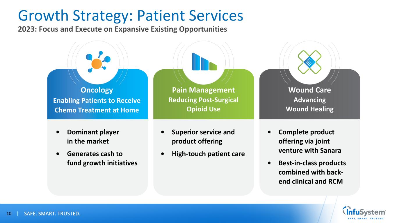 “The patient is at the center of everything we do.” Patient Services Oncology (Core Business) Is Profitable and Stable Growth Opportunities Are Pain Management and Wound Care Clinical Support/ Case Management Device Logistics Revenue Cycle Management Device Repair & Maintenance 9 Unique High-Service Platform, Third-Party Payer Model INFU Is Paid by the Patient’s Insurance Provider