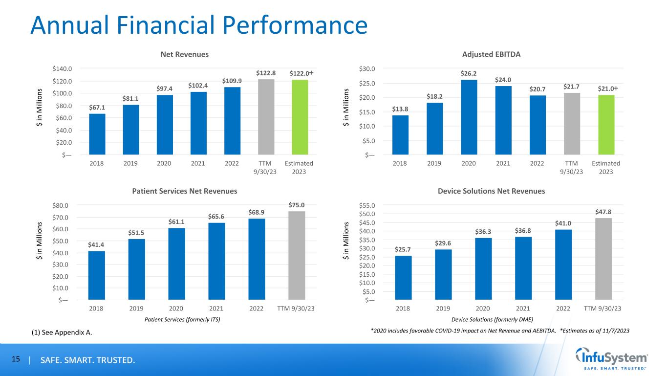 Quarterly Trends *2020 includes favorable COVID-19 impact on Net Revenue and AEBITDA.(1) See Appendix A. 14 Net Revenue Quarterly Trend $21.6 $26.0 $25.1 $24.7$24.5 $24.8 $26.6 $26.5$26.8 $27.0 $27.3 $28.8 $30.4 $31.7 $31.9 2020 2021 2022 2023 1st Quarter 2nd Quarter 3rd Quarter 4th Quarter $— $10.0 $20.0 $30.0 $40.0 Adjusted EBITDA Quarterly Trend $4.0 $8.5 $7.5 $6.2$6.2 $5.9 $5.5 $6.5 $4.1 $5.5 $5.6 $5.5 $4.2 $5.8 $6.2 2020 2021 2022 2023 1st Quarter 2nd Quarter 3rd Quarter 4th Quarter $— $1.0 $2.0 $3.0 $4.0 $5.0 $6.0 $7.0 $8.0 $9.0 $ in M ill io ns $ in M ill io ns