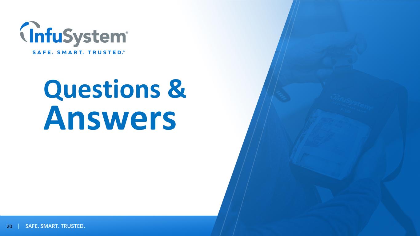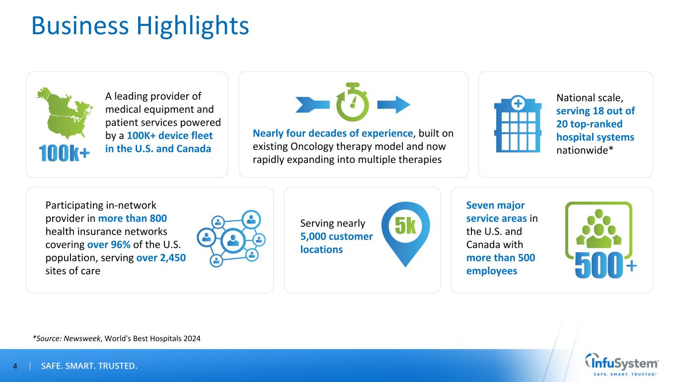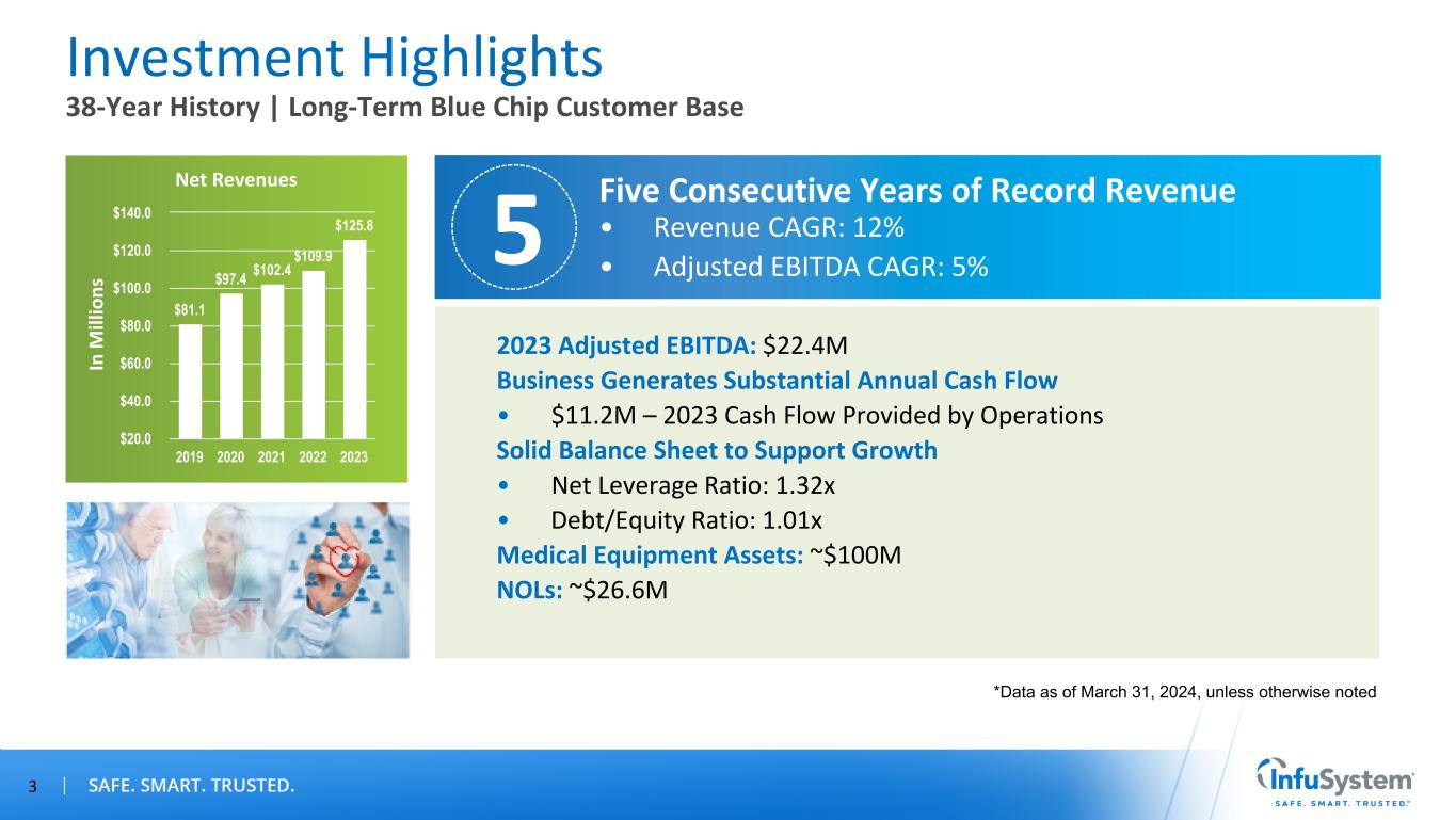 Forward-Looking Statements / Non-GAAP Measures Forward-Looking Statements Certain statements contained in this presentation are forward-looking statements within the meaning of Section 27A of the Securities Act of 1933, as amended, and Section 21E of the Securities Exchange Act of 1934, as amended, such as statements relating to future actions, our share repurchase program and capital allocation strategy, business plans, strategic partnerships, growth initiatives, objectives and prospects, future operating or financial performance, guidance and expected new business relationships and the terms thereof (including estimated potential revenue under new or existing contracts). The words “believe,” “may,” “will,” “estimate,” “continue,” “anticipate,” “intend,” “should,” “plan,” "goal," “expect,” “strategy,” “future,” “likely,” variations of such words, and other similar expressions, as they relate to the Company, are intended to identify forward-looking statements. Forward-looking statements are subject to factors, risks and uncertainties that could cause actual results to differ materially, including, but not limited to, our ability to successfully execute on our growth initiatives and strategic partnerships, our ability to enter into definitive agreements for the new business relationships on expected terms or at all, our ability to generate estimated potential revenue amounts under new or existing contracts, our dependence on estimates of collectible revenue, potential litigation, changes in third-party reimbursement processes, changes in law, global financial conditions and recessionary risks, rising inflation and interest rates, supply chain disruptions, systemic pressures in the banking sector, including disruptions to credit markets, the Company's ability to remediate its previously disclosed material weakness in internal control over financial reporting, contributions from acquired businesses or new business lines, products or services and other risk factors disclosed in the Company’s most recent annual report on Form 10-K and, to the extent applicable, quarterly reports on Form 10-Q. Our strategic partnerships are subject to similar factors, risks and uncertainties. All forward-looking statements made in this presentation speak only as of the date hereof. InfuSystem does not undertake any obligation to update any forward-looking statements to reflect future events or circumstances, except as required by law. Non-GAAP Measures This presentation contains information prepared in conformity with GAAP as well as non-GAAP financial information. The Company believes that the non-GAAP financial measures presented in this presentation provide useful information to the Company’s management, investors and other interested parties about the Company’s operating performance because they allow them to understand and compare the Company’s operating results during the current periods to the prior year periods in a more consistent manner. This non-GAAP information should be considered by the reader in addition to, but not instead of, the financial statements prepared in accordance with GAAP, and similarly titled non-GAAP measures may be calculated differently by other companies. The Company calculates those non-GAAP measures by adjusting for nonrecurring or non-core items that are not part of the normal course of business and that the Company’s management does not believe will have similar comparable year-over-year items. A reconciliation of those measures to the most directly comparable GAAP measures is provided in Appendix A of this presentation. 2