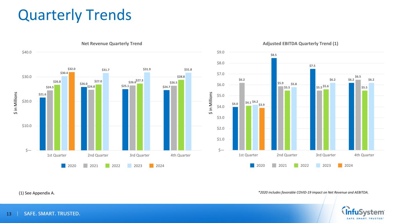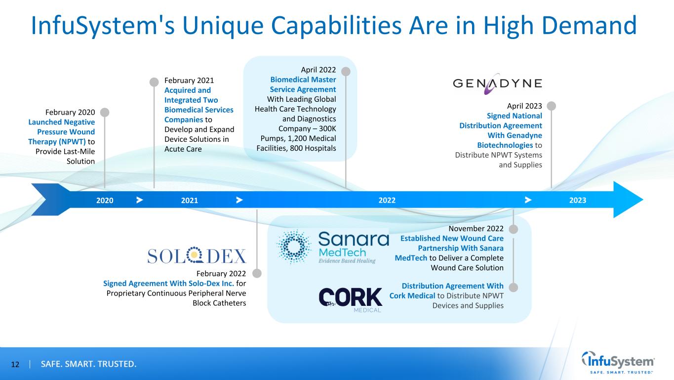 InfuSystem's Unique Capabilities Are in High Demand February 2021 Acquired and Integrated Two Biomedical Services Companies to Develop and Expand Device Solutions in Acute Care February 2022 Signed Agreement With Solo-Dex Inc. for Proprietary Continuous Peripheral Nerve Block Catheters April 2022 Biomedical Master Service Agreement With Leading Global Health Care Technology and Diagnostics Company – 300K Pumps, 1,200 Medical Facilities, 800 Hospitals 2021 2022 November 2022 Established New Wound Care Partnership With Sanara MedTech to Deliver a Complete Wound Care Solution Distribution Agreement With Cork Medical to Distribute NPWT Devices and Supplies 2023 April 2023 Signed National Distribution Agreement With Genadyne Biotechnologies to Distribute NPWT Systems and Supplies 12 February 2020 Launched Negative Pressure Wound Therapy (NPWT) to Provide Last-Mile Solution 2020