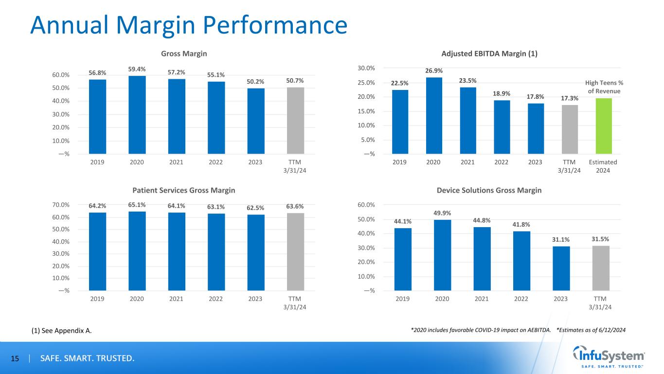 Annual Financial Performance 14 $ in M ill io ns $ in M ill io ns Net Revenues $81.1 $97.4 $102.4 $109.9 $125.8 $127.4 $134.2 2019 2020 2021 2022 2023 TTM 3/31/24 Estimated 2024 $— $20.0 $40.0 $60.0 $80.0 $100.0 $120.0 $140.0 $160.0 Adjusted EBITDA (1) $18.2 $26.2 $24.0 $20.7 $22.4 $22.0 $26.5 2019 2020 2021 2022 2023 TTM 3/31/24 Estimated 2024 $— $5.0 $10.0 $15.0 $20.0 $25.0 $30.0 Patient Services Net Revenues $51.5 $61.1 $65.6 $68.9 $76.5 $76.4 2019 2020 2021 2022 2023 TTM 3/31/24 $— $10.0 $20.0 $30.0 $40.0 $50.0 $60.0 $70.0 $80.0 $90.0 Device Solutions Net Revenues $29.6 $36.3 $36.8 $41.0 $49.3 $51.1 2019 2020 2021 2022 2023 TTM 3/31/24 $— $5.0 $10.0 $15.0 $20.0 $25.0 $30.0 $35.0 $40.0 $45.0 $50.0 $55.0 (1) See Appendix A. $ in M ill io ns $ in M ill io ns *Estimates as of 6/12/2024*2020 includes favorable COVID-19 impact on Net Revenue and AEBITDA. High Single Digit % Growth High Teens % of Revenue