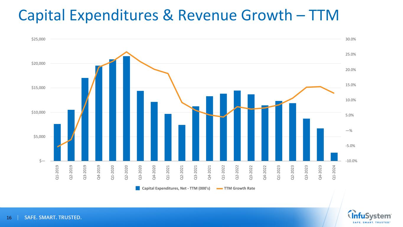 Annual Margin Performance 15 Gross Margin 56.8% 59.4% 57.2% 55.1% 50.2% 50.7% 2019 2020 2021 2022 2023 TTM 3/31/24 —% 10.0% 20.0% 30.0% 40.0% 50.0% 60.0% Adjusted EBITDA Margin (1) 22.5% 26.9% 23.5% 18.9% 17.8% 17.3% 19.7% 2019 2020 2021 2022 2023 TTM 3/31/24 Estimated 2024 —% 5.0% 10.0% 15.0% 20.0% 25.0% 30.0% Patient Services Gross Margin 64.2% 65.1% 64.1% 63.1% 62.5% 63.6% 2019 2020 2021 2022 2023 TTM 3/31/24 —% 10.0% 20.0% 30.0% 40.0% 50.0% 60.0% 70.0% Device Solutions Gross Margin 44.1% 49.9% 44.8% 41.8% 31.1% 31.5% 2019 2020 2021 2022 2023 TTM 3/31/24 —% 10.0% 20.0% 30.0% 40.0% 50.0% 60.0% (1) See Appendix A. *Estimates as of 6/12/2024*2020 includes favorable COVID-19 impact on AEBITDA. High Teens % of Revenue