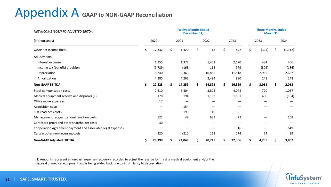 Appendix A GAAP to NON-GAAP Reconciliation 21 NET INCOME (LOSS) TO ADJUSTED EBITDA: Twelve Months Ended December 31, Three Months Ended March 31, (in thousands) 2020 2021 2022 2023 2023 2024 GAAP net income (loss) $ 17,332 $ 1,420 $ 18 $ 872 $ (324) $ (1,112) Adjustments: Interest expense 1,255 1,377 1,402 2,170 484 456 Income tax (benefit) provision (9,789) (163) 112 979 (302) (186) Depreciation 9,740 10,363 10,866 11,518 2,955 2,652 Amortization 4,285 4,262 2,494 990 248 248 Non-GAAP EBITDA $ 22,823 $ 17,259 $ 14,892 $ 16,529 $ 3,061 $ 2,058 Stock compensation costs 2,610 6,404 3,825 4,074 720 1,057 Medical equipment reserve and disposals (1) 178 194 1,162 1,501 430 (104) Office move expenses 17 — — — — — Acquisition costs — 154 — — — — SOX readiness costs — 199 110 — — — Management reorganization/transition costs 521 49 633 72 — 108 Contested proxy and other shareholder costs 30 — — — — — Cooperation Agreement payment and associated legal expenses — — — 16 — 649 Certain other non-recurring costs 220 (210) 123 174 24 89 Non-GAAP Adjusted EBITDA $ 26,399 $ 24,049 $ 20,745 $ 22,366 $ 4,235 $ 3,857 (1) Amounts represent a non-cash expense (recovery) recorded to adjust the reserve for missing medical equipment and/or the disposal of medical equipment and is being added back due to its similarity to depreciation.