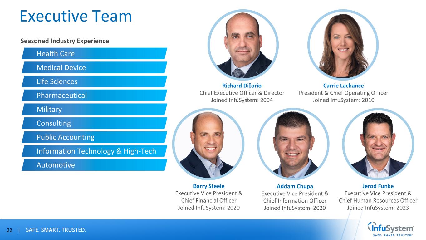 Barry Steele Executive Vice President & Chief Financial Officer Joined InfuSystem: 2020 Richard DiIorio Chief Executive Officer & Director Joined InfuSystem: 2004 Carrie Lachance President & Chief Operating Officer Joined InfuSystem: 2010 Addam Chupa Executive Vice President & Chief Information Officer Joined InfuSystem: 2020 Executive Team Seasoned Industry Experience Health Care Medical Device Life Sciences Pharmaceutical Military Consulting Public Accounting Information Technology & High-Tech Automotive 22 Jerod Funke Executive Vice President & Chief Human Resources Officer Joined InfuSystem: 2023