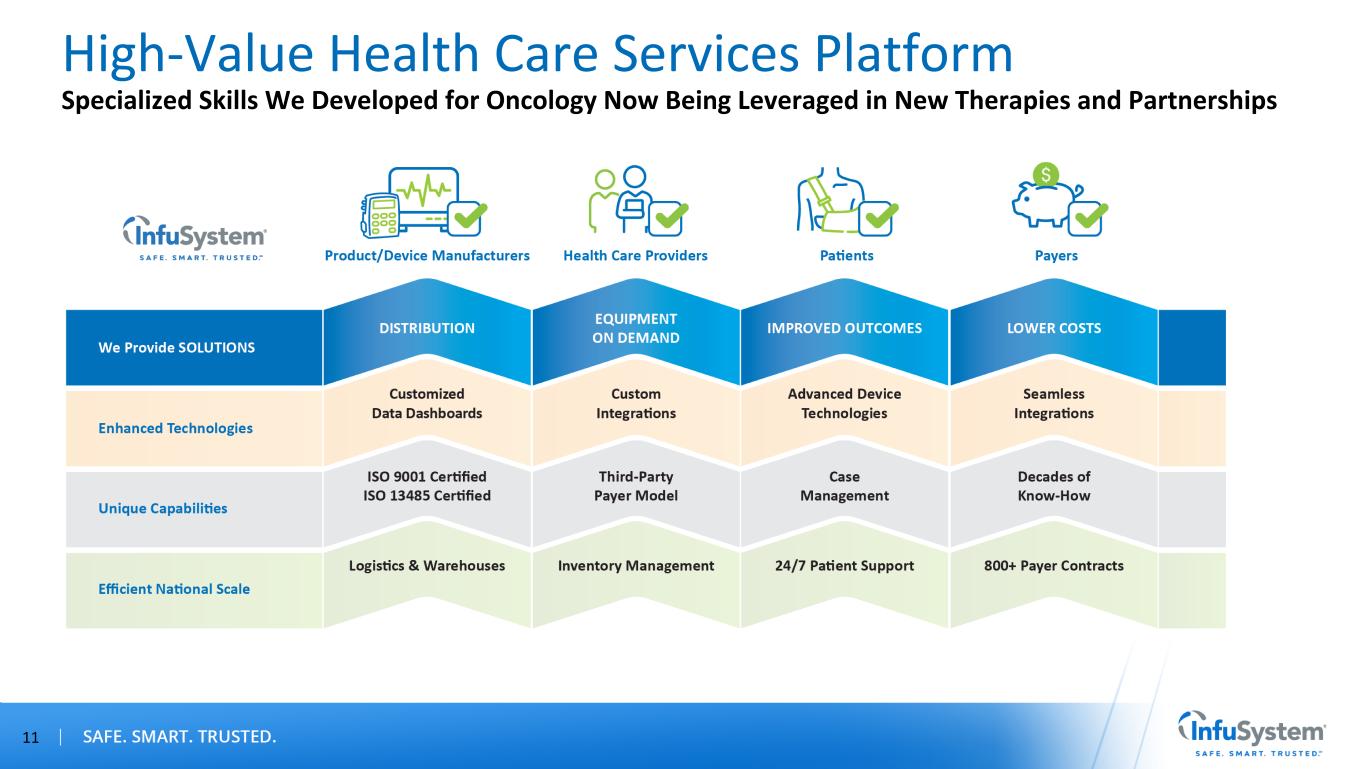 Managing the Device Throughout the Treatment Cycle SOLUTIONS Manufacturer Provider Payer Patient • Distribution • Device support • Improved outcomes • Lower costs • Devices on demand • White Glove services • Third-party payer billing • Access to advanced devices and products • 24/7 patient support Connecting and Enhancing Processes for Key Stakeholders To Solve Complex Problems 10