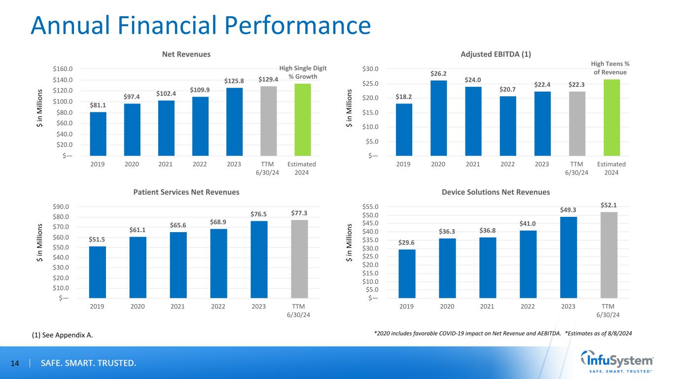 Quarterly Trends (1) See Appendix A. 13 Net Revenue Quarterly Trend $21.6 $26.0 $25.1 $24.7$24.5 $24.8 $26.6 $26.5$26.8 $27.0 $27.3 $28.8 $30.4 $31.7 $31.9 $31.8$32.0 $33.7 2020 2021 2022 2023 2024 1st Quarter 2nd Quarter 3rd Quarter 4th Quarter $— $10.0 $20.0 $30.0 $40.0 Adjusted EBITDA Quarterly Trend (1) $4.0 $8.5 $7.5 $6.2$6.2 $5.9 $5.5 $6.5 $4.1 $5.5 $5.6 $5.5 $4.2 $5.8 $6.2 $6.2 $3.9 $6.1 2020 2021 2022 2023 2024 1st Quarter 2nd Quarter 3rd Quarter 4th Quarter $— $1.0 $2.0 $3.0 $4.0 $5.0 $6.0 $7.0 $8.0 $9.0 $ in M ill io ns $ in M ill io ns *2020 includes favorable COVID-19 impact on Net Revenue and AEBITDA.