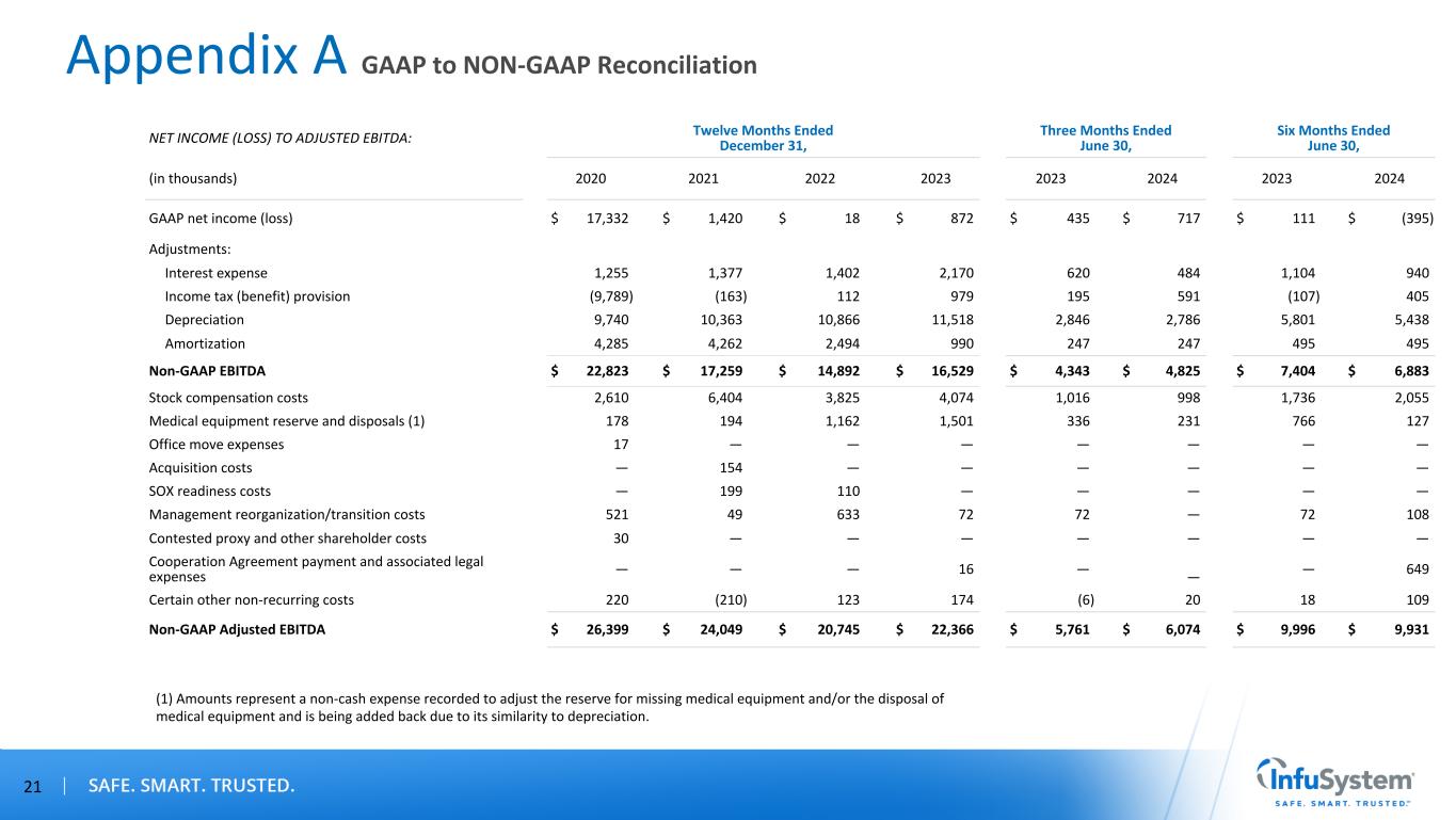Appendix A GAAP to NON-GAAP Reconciliation 21 NET INCOME (LOSS) TO ADJUSTED EBITDA: Twelve Months Ended December 31, Three Months Ended June 30, Six Months Ended June 30, (in thousands) 2020 2021 2022 2023 2023 2024 2023 2024 GAAP net income (loss) $ 17,332 $ 1,420 $ 18 $ 872 $ 435 $ 717 $ 111 $ (395) Adjustments: Interest expense 1,255 1,377 1,402 2,170 620 484 1,104 940 Income tax (benefit) provision (9,789) (163) 112 979 195 591 (107) 405 Depreciation 9,740 10,363 10,866 11,518 2,846 2,786 5,801 5,438 Amortization 4,285 4,262 2,494 990 247 247 495 495 Non-GAAP EBITDA $ 22,823 $ 17,259 $ 14,892 $ 16,529 $ 4,343 $ 4,825 $ 7,404 $ 6,883 Stock compensation costs 2,610 6,404 3,825 4,074 1,016 998 1,736 2,055 Medical equipment reserve and disposals (1) 178 194 1,162 1,501 336 231 766 127 Office move expenses 17 — — — — — — — Acquisition costs — 154 — — — — — — SOX readiness costs — 199 110 — — — — — Management reorganization/transition costs 521 49 633 72 72 — 72 108 Contested proxy and other shareholder costs 30 — — — — — — — Cooperation Agreement payment and associated legal expenses — — — 16 — — — 649 Certain other non-recurring costs 220 (210) 123 174 (6) 20 18 109 Non-GAAP Adjusted EBITDA $ 26,399 $ 24,049 $ 20,745 $ 22,366 $ 5,761 $ 6,074 $ 9,996 $ 9,931 (1) Amounts represent a non-cash expense recorded to adjust the reserve for missing medical equipment and/or the disposal of medical equipment and is being added back due to its similarity to depreciation.